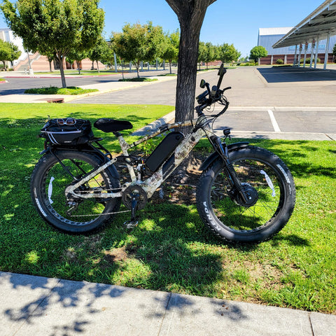 Similarly, our Defender S is designed for the outdoors and travelling with nature. Models are available in a forest cobra wrap, grey or black, has a payload capacity of 440lbs, 26” x 4.0 “ fat Kenda sport tires, a range of 80 miles and a max speed of 30 mph. The original price of the Defender S is $2,899.00, but if you use our discount code at checkout, “15off”, you can save over $400.